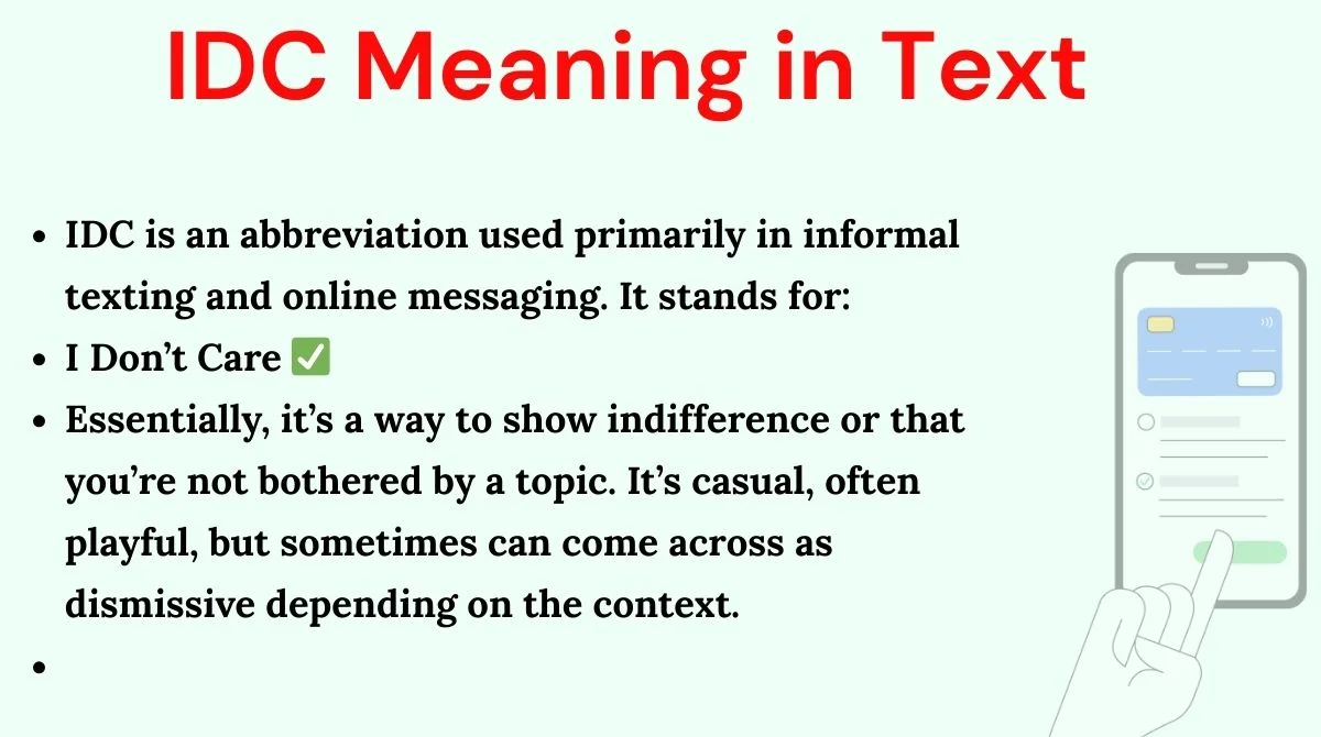 If you’ve seen someone type “IDC” in a conversation and wondered what it means, you’re not alone. Short, snappy, and a little casual, IDC meaning in text can sometimes confuse those who are new to online chats or social media platforms.