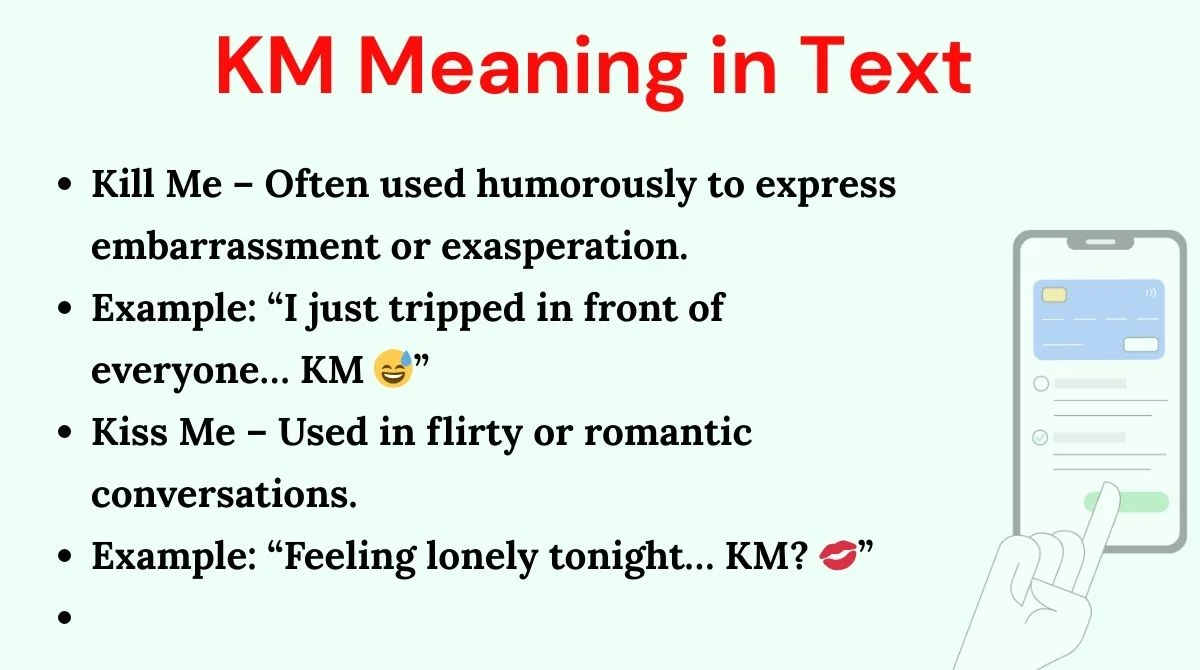 Example: “I just tripped in front of everyone… KM 😅” - Kiss Me – Used in flirty or romantic conversations.