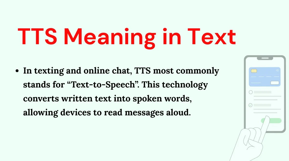 In texting and online chat, TTS most commonly stands for “Text-to-Speech”. This technology converts written text into spoken words, allowing devices to read messages aloud.