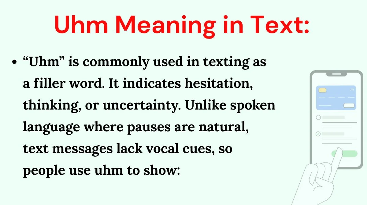 “Uhm” is commonly used in texting as a filler word. It indicates hesitation, thinking, or uncertainty. Unlike spoken language where pauses are natural, text messages lack vocal cues, so people use uhm to show: