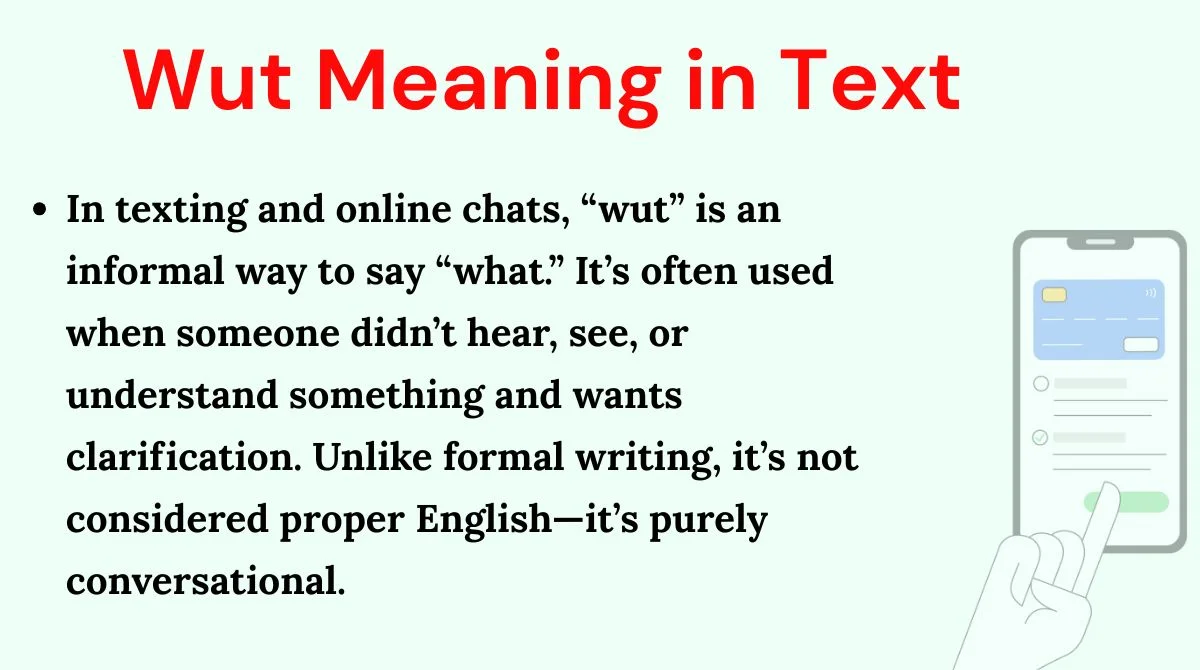 In texting and online chats, “wut” is an informal way to say “what.” It’s often used when someone didn’t hear, see, or understand something and wants clarification. Unlike formal writing, it’s not considered proper English—it’s purely conversational.